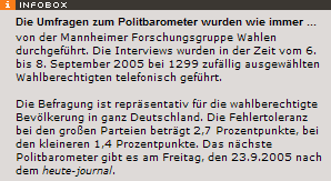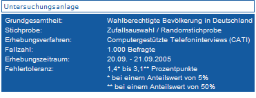 | 15.09.2005 | 42 | 35 | 7 | 6 | 8 | Forsa | 2504 (keine Angabe) |