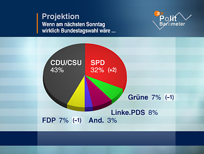 2. SPD und Grüne picken sich die Rosinen aus dem ZDF-Politbarometer-Kuchen naturgemäß etwas anders heraus: Sie bedienen sich mit 36,4% bzw. 9,2% am Umfrageergebnis und ergattern damit eine Regierungsmehrheit von 45,6%, was für die Fortsetzung ihrer Wackelkontakte gerade ausreicht. Denn die FDP wird mit 4,8% unter der 5%-Hürde versenkt und die Union mit 38,6% abgedeckelt. Den Rest überlässt Rotgrün den grauen Panthern und Gysi&Lafontaine zur Bekämpfung der Rentenreform und Hartz IV.
