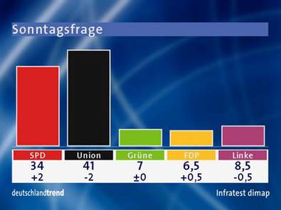 Am 8. September 2005 wurden in der ARD-Tagesschau und ARD-Tagesthemen der neueste (und letzte) DeutschlandTrend vor der Wahl aufgeführt. Aus Kosten- und Zeitgründen kann nur ein winziger Bruchteil der über 60 Millionen Wahlberechtigten befragt werden. Infratest-dimap hat diesmal ganze 1000 Wahlberechtigte vom 5. bis 7. September befragt, deren Telefonnummern ausgelost wurden. In der Tagesschau jammerte WDR-Chefredaktor Jörg Schönenborn "10 Tage vor der Wahl wissen viele immer noch nicht, wem sie ihre Stimme geben sollen. Mit 20% ist der Anteil der Unentschiedenen recht hoch und von denen, die sich entschieden haben, sind viele unsicher." Da außerdem sich regelmäßig etwa 5-10% der Befragten als Nichtwähler outen, bedeutet dies, dass höchstens zwei Drittel der 1000 Befragten eine definitive Angabe über die Partei machten. Das Umfrageergebnis lautete