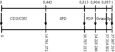Für die effektive Durchführung der Simulation auf einem Computer wird nur die Anzahl der Parteien, ihre prozentualen Stärken und der Umfang des repräsentativen Querschnitts eingegeben, nicht aber die Anzahl der Wahlteilnehmer. Die Nummer eines Wahlteilnehmers wird durch ein kleines Intervall der Länge L=1/37.867.319 ersetzt, und diese werden der Reihe nach auf einer Zahlenachse mit Anfangspunkt 0 und Endpunkt 1 aufgetragen, wie dieses in folgendem Bild illustriert wird