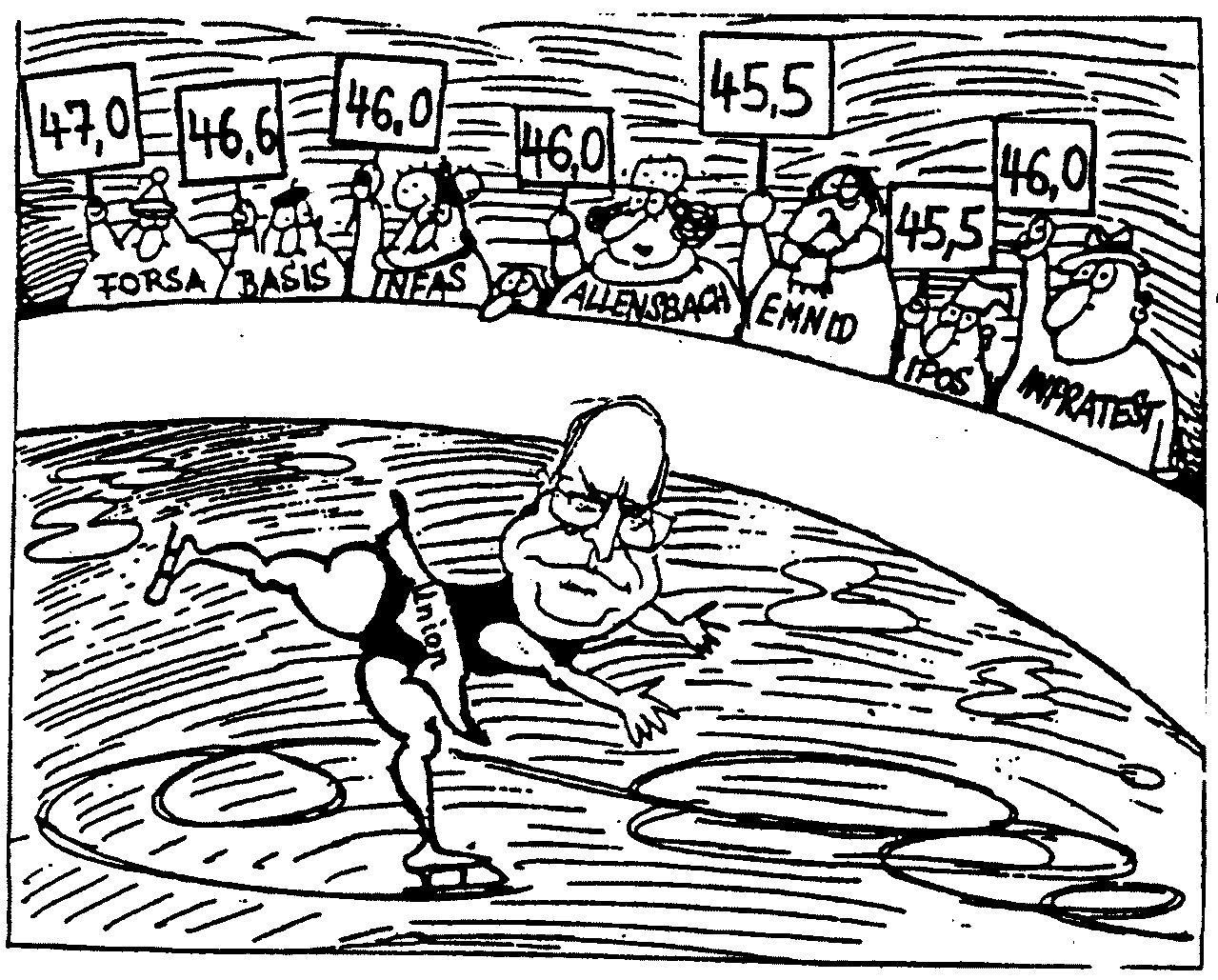 Tragically the pollsters magic formula frequently produces surrealistic results which they don't dare to sell because they just don't look right. To cover up the further doctoring of half-baked results our pollsters have developed a highfalutin nomenclature which exceeds any standard one might ever have. The minor blemish is that they arrive at the final results in a completely different way: To produce a forecast they merely adjust the results of the last election a little bit upwards or downwards according to the alleged direction of the political trend. They largely ignore current 1poll results and use them, if at all, to determine the alleged direction of the trend. Considering the uncontrollable nature of lottery and interview errors, this adventure requires that blend of unlimited self-confidence and unshakeable ignorance with which usually only politicians are endowed. As for the famous "Sunday-question":