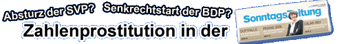 Man kann es der SonntagsZeitung nachfühlen, dass sie keine Lust verspürte, die gross aufgemachte Story damit wie eine Seifenblase platzen zu lassen: Denn der von www.isopublic.ch im Methodenbericht angegebene Fehlerbereich (alias maximale Standardabweichung) beträgt +/- 4,47%. Das könnte einen renitenten Leser veranlassen, das Resultat selber auszurechnen. Natürlich vorausgesetzt, dass er nicht wie Burg & Lauer zahlengläubig ist und an Rechenschwäche leidet. Nach Adam Riese stürzte die SVP gar nicht auf 23,3% ab, sondern auf irgendwo zwischen 18,83% und 27,47%. Und die Senkrechtstarterin BDP kam nicht auf 3,8%, sondern landete irgendwo zwischen 0% und 8,27%. Die vollständige Botschaft der SonntagsZeitung lautet somit